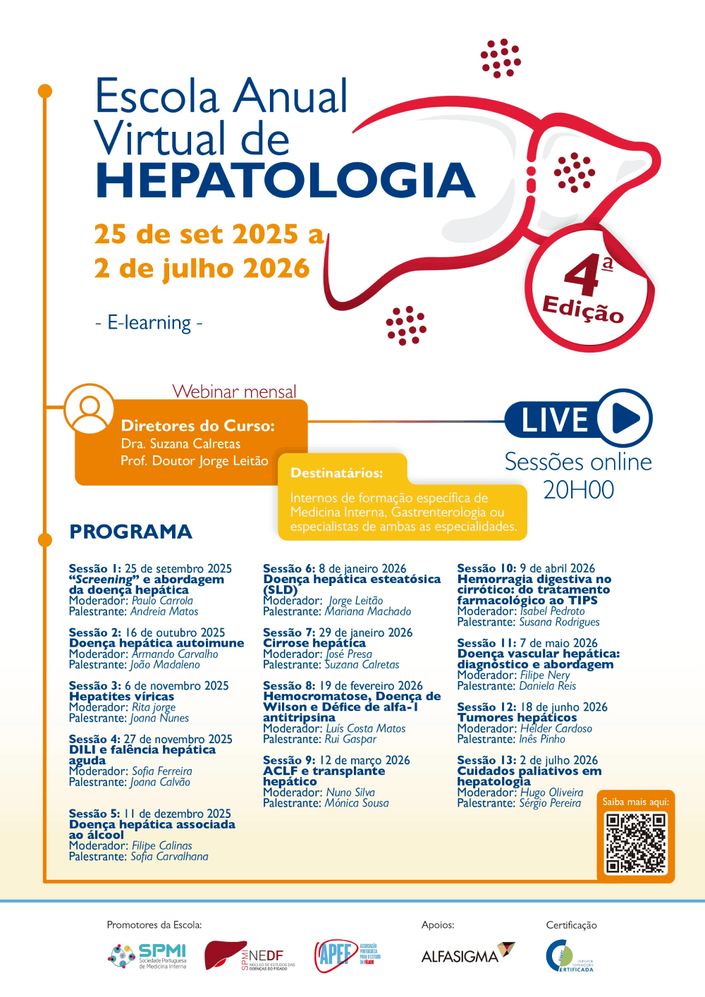 A quarta edição da Escola Anual Virtual de Hepatologia realiza-se de 25 de setembro de 2025 a 2 de Julho de 2026 em formato e-learning! As inscrições estão encerradas.